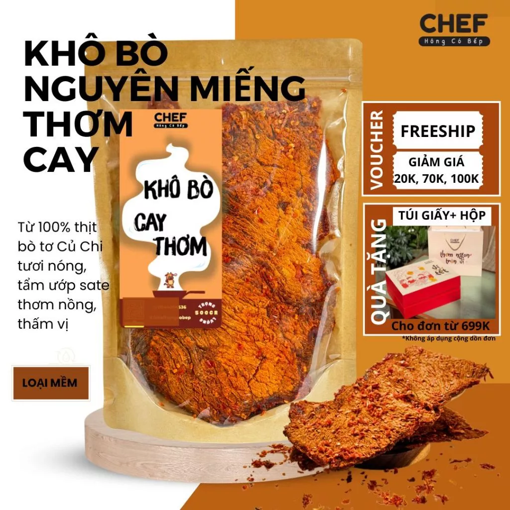 Nếu bạn đang tìm kiếm một loại khô bò mềm, không vụn và đảm bảo an toàn thực phẩm, hãy thử tham khảo sản phẩm KHÔ BÒ CHEF Hông có bếp cay ngon CỰC PHẨM 500gr – NGUYÊN MIẾNG MỀM TO- Đồ ăn vặt sạch, không vụn. Sản phẩm này được sản xuất từ thịt bò tươi ngon và không chứa nhiều phụ gia.